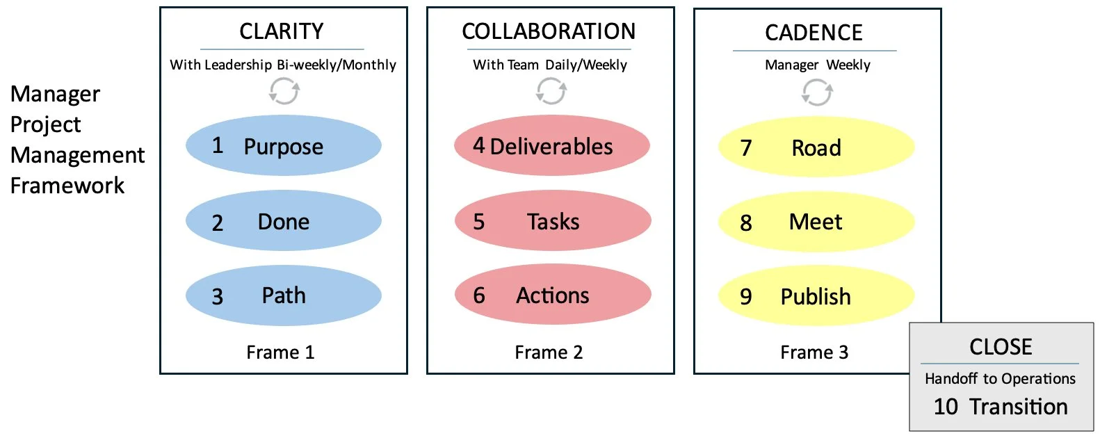 The three-frame framework of CLARITY - COLLABORATION - CADENCE is memorable, operational, and repeatable. It mirrors how a busy manager actually thinks.