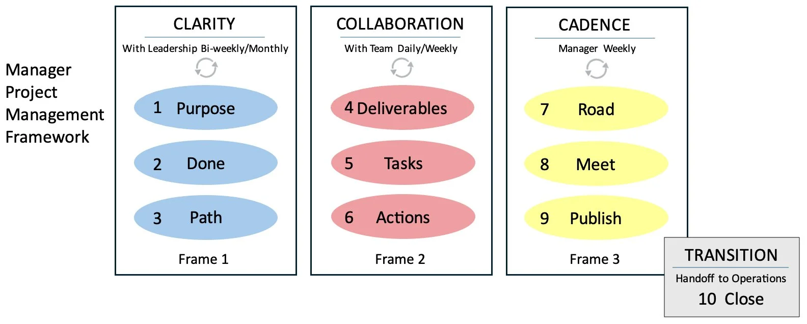Understand the simple steps to get CLARITY with the leadership. Then engage the team through COLLABORATION. Then develop a CADENCE with a simple weekly rhythm. And eventually, TRANSITION and CLOSE cleanly.
